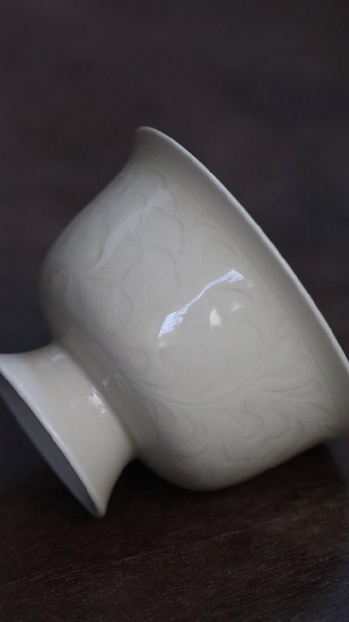 Chén chân cao (高足杯) sứ Định diêu (bạch định) được sử dụng đất tinh khiết, nước men chất lượng cao, không sử dụng công nghệ mới hay màu men công nghiệp. Họa tiết hoa mẫu đơn (quốc hoa của Trung Quốc) khắc bằng dao chìm có chiều sâu rất tinh tế.