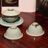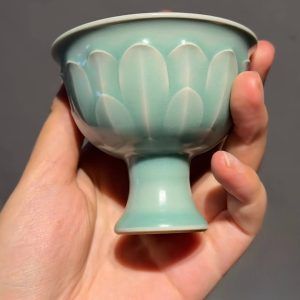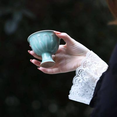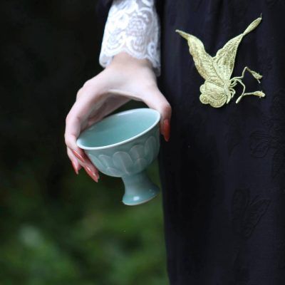 Chén chân cao sứ Long tuyền của Dương Thịnh Khản được chế tác hoàn toàn thủ công. Chén được khắc bằng dao họa tiết hoa sen nổi trên chén trông rất tinh tế và sắc nét.