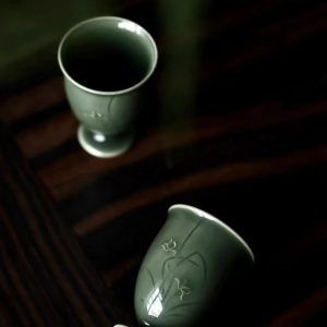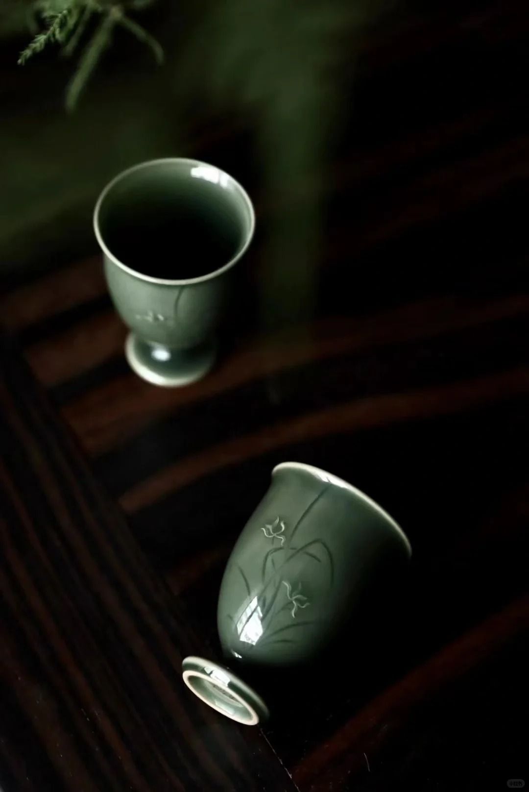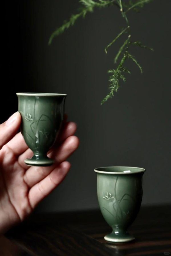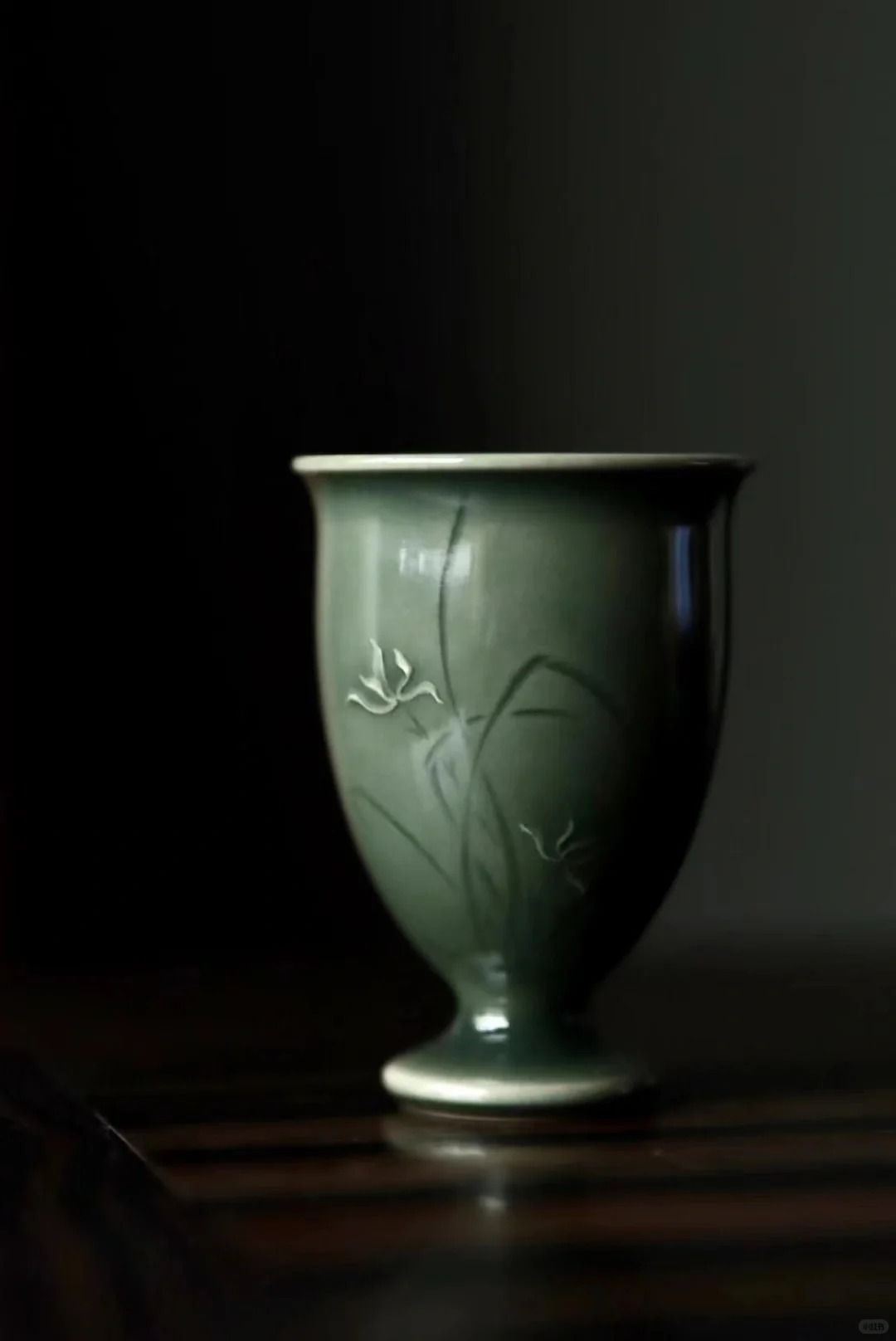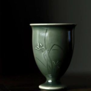 Tác phẩm chén thương hương men Mai Tử Thanh của Nghiêm Thiếu Anh, chén được vuốt rất đẹp, khắc nổi hình hoa lan trên nền men xanh mận.