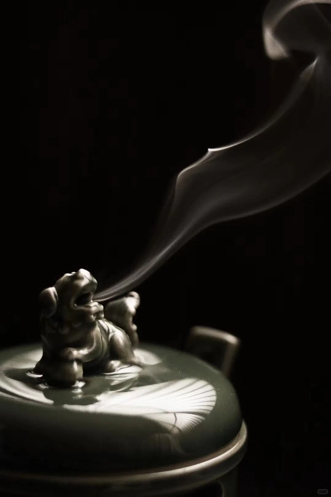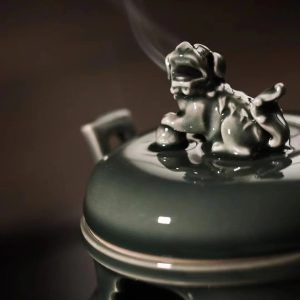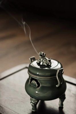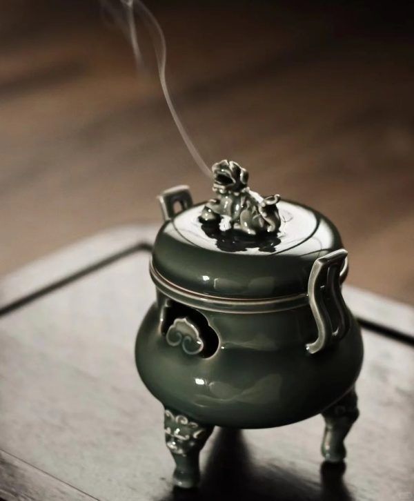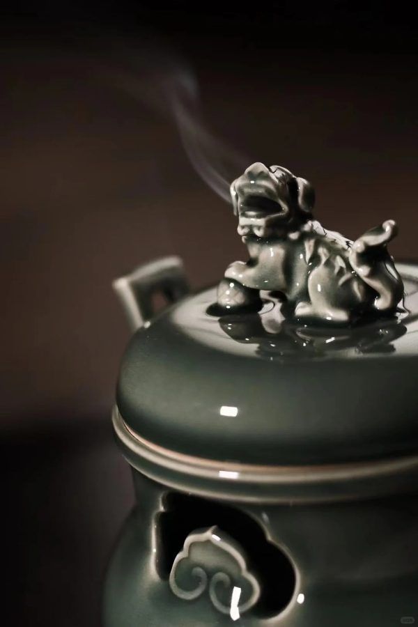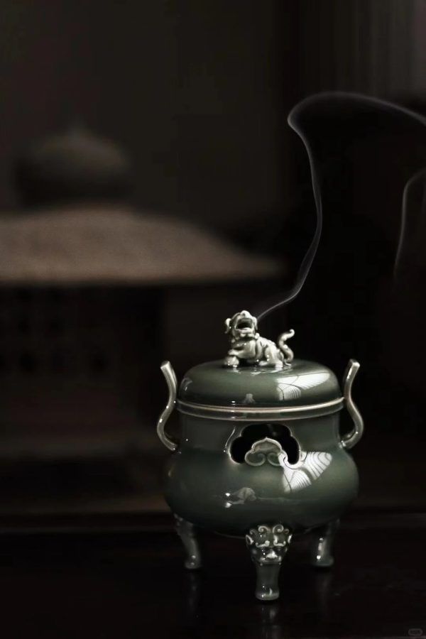 Tác phẩm lư hương men ngọc Long tuyền Mai Tử Thanh của Nghiêm Thiếu Anh. Dáng lư “Triều Quan Nhĩ Lô” với phần tai (quai) được tạo hình giống như mũ quan triều đình – một biểu tượng mang tính trang trọng và quyền quý trong văn hóa cổ TQ.